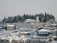 The snow-covered landscape of Griva, including the church of St. Athanasius the Great, located in the center