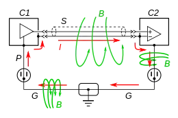 Ground loop current induced by stray AC magnetic fields (B, green) - Another less common source of ground loop currents, particularly in high-power equipment, is current leaking from the hot side of the power line into the ground system.[3][8] In addition to resistive leakage, current can also be induced through low impedance capacitive or inductive coupling. The ground potential at different outlets may differ by as much as 10 to 20 volts[4] due to voltage drops from these currents. The diagram shows leakage current from an appliance such as an electric motor A flowing through the building's ground system G to the neutral wire at the utility ground bonding point at the service panel. The ground loop between components C1 and C2 creates a second parallel path for the current.[8] The current divides, with some passing through component C1, the signal cable S ground conductor, C2 and back through the outlet into the ground system G. The AC voltage drop across the cable's ground conductor from this current introduces hum or interference into component C2.[8]