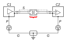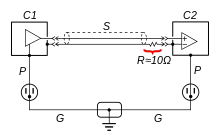 The diagrams in this section show a typical ground loop caused by a signal cable S connecting two grounded electronic components C1 and C2. The loop consists of the signal cable's ground conductor, which is connected through the components' metal chassis to the ground wires P in their power cords, which are plugged into outlet grounds which are connected through the building's utility ground wire system G.