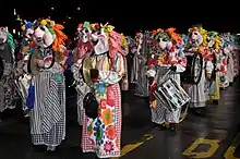 Guggenmusik is played during Fasnacht, the Swabian-Alemannic carnival season (Swabian–Alemannic Fastnacht), which is celebrated in various localities as the Basler Fasnacht, Luzerner Fasnacht, Eis-zwei-Geissebei in Rapperswil, and many other terms. The most common explanation of the word "Gugge" is that it may derive from the Alemannic "Sack/Tüte", meaning "bag". Other unsourced explanations include the word used for a small children's trumpet, a (Swiss German) word for "scream", or the cuckoo's call.[1] A "Guggemusik" band thus refers to a group of people playing loud music and typically wearing costumes and masks in a uniform style.