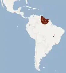 The Guianan bonneted bat is found primarily in Guyana and Suriname, but may also be found in neighbouring parts of Brazil and Venezuela.[2] Little is known of the bat's habitat preferences, but it has been found in humid lowland evergreen forests and pine plantations.[3]
