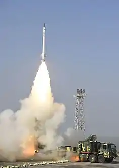 Solid fueled Prahar and Pranash are being tested to replace existing Prithvi missiles.[44] Export variant "Pragati" was exhibited in South Korea in 2013 but didn't receive any orders.[45][46] Pralay is another battlefield range ballistic missile with better range being developed from PDV anti-ballistic missile.[47]