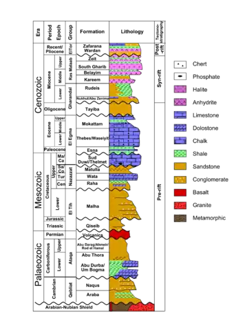 The continental sandstones and siltstones of the Abu Zenima Formation represent the earliest syn-rift deposits of late Oligocene (Chattian) to early Miocene (Aquitanian) age. Locally the Abu Zenima Formation is capped by basalts. The lower Miocene age conglomerates, sandstones and marls of the Nukhul Formation were deposited in shallow marine conditions as the sea began to flood the developing rift. The Nukhul Formation overlies the Abu Zenima Formation in some place but elsewhere is probably age equivalent, reflecting a diachronous change to marine conditions within the rift.[3]