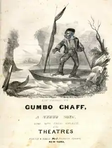 The title character was one of the earliest blackface characters in the United States. He was based largely on the tall-tale riverboatsmen and frontiersmen characters that were popular in fiction during the Jacksonian Era. "Gumbo Chaff" merged these frontier elements with stereotypes of black slaves, creating a new character who lives "On de Ohio bluff in de state of Indiana" and who "jump into [his] kiff / And . . . down de river driff, / And . . . cotch as many cat fish as ever nigger liff."[1] Due to this song's popularity, the black riverboatsman (usually named "Gumbo Chaff") became a popular character in minstrelsy for a time. Blackface singers would often perform "Gumbo Chaff" with a mock flatboat on stage.