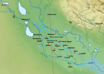 According to the year name for Gungunum's 19th year, i.e. 1914 BC, the king of Larsa destroyed the army of Malgium, "secured the road-house" and "opened the source of the mountain canal" at the command of the gods An, Enlil and Nanna.[19] While it is difficult to determine the exact meaning of the latter two statements, the victory against Malgium provides a clear indication of a northern campaign along the Tigris on Gungunum's part, as the city of Malgium was located somewhere on the banks of this great river between Maškan-šapir and its confluence with the Diyala river further north.[20] This region is situated well northeast of Isin, and Gungunum's incursion into the area shows that Larsa now possessed a military reach that extended farther north than ever before.