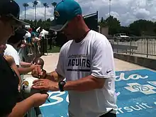 Gus Bradley signing autographs for fans at Jaguars training camp in 2016