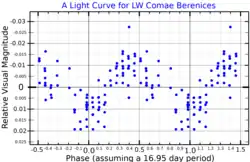 HD 111395 is a single,[12] variable star in the northern constellation of Coma Berenices. It has the variable star designation LW Com, short for LW Comae Berenices;[5] HD 111395 is the Henry Draper Catalogue designation. The star has a yellow hue and is just bright enough to be barely visible to the naked eye with an apparent visual magnitude that fluctuates around 6.29.[3] Based upon parallax measurements, it is located at a distance of 55.8 light years from the Sun.[2] The star is drifting closer with a radial velocity of −8.9 km/s.[6] It is a member of the Eta Chamaeleontis stellar kinematic group.[13]
