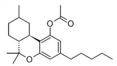 HHC-acetate (Hexahydrocannabinol-O-acetate, HHC-O) is a semi-synthetic cannabinoid derivative which has been marketed since around 2022.[1][2] It is believed to be made in a multi step process from cannabidiol derived from hemp.[3] The legal status of hexahydrocannabinol and derivatives such as HHC-O varies between countries leading to widespread sale in some jurisdictions in Europe and the US, but in France HHC and HHC-O were banned in 2023, and HHC is already banned in several other countries.[4]