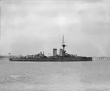 Ordered under the 1910–1911 Naval Estimates,[6] Audacious was the third ship of her name to serve in the Royal Navy.[7] The ship was laid down by Cammell Laird at their shipyard in Birkenhead on 23 March 1911[8] and launched on 14 September 1912.[9] She was completed in August 1913 at a cost of £1,918,813,[3] but was not commissioned until 15 October, joining her sister ships in the 2nd Battle Squadron. All four sisters represented the Royal Navy during the celebrations of the re-opening of the Kaiser Wilhelm Canal in Germany in June 1914.[10]