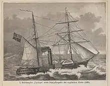 The Cyclops was a first class sloop launched on 10 July 1839 and completed in February 1840. Built in the Royal Navy dockyard in Pembroke Dock, Pembrokeshire in Wales[1] with a wooden hull, she weighed 1,195 tons, had six guns and was propelled by a paddle in the middle of the ship[2] powered by J. & S. Seaward and Capel two-cylinder 'Gorgon' engines giving a top speed of 9.5 knots. The Cyclops was originally intended as a sister ship for the Gorgon but in July 1838 her design was altered by adding a 12 foot long midships section and she became a steam frigate, changing to a corvette in the 1850s. At that time she was the largest steam warship in the world.[3]