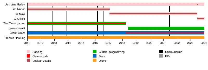 - Ben Marvin – rapping, unclean vocals (2011–2017)