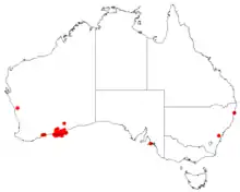 Coastal hakea is found on the mainland and on some of the islands between Israelite Bay and Esperance and a single population is known at Hopetoun to the west.[3] The range covers southeastern areas of the Southwest Botanical Province. The species grows in rocky sandy clay soils among granite outcrops and withstands salt laden winds.[8]