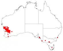 It is endemic to an area in the Wheatbelt and Mid West regions of Western Australia from around Northampton in the north west to Mount Magnet in the northeast to around Merredin in the south and grows in sandy, loamy or gravelly soils.[3] It is often found on sandplains where it is part of shrubland communities that are dominated by species of Acacia or Melaleuca.[2]