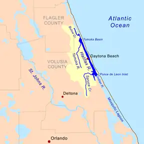 The Halifax River originates at Tomoka Bay, at the confluence of the Tomoka River, Bulow Creek, and Halifax Creek, adjoining Tomoka State Park. The Halifax River's drainage basin (or catchment) includes most of eastern Volusia County, which includes the flow from the Tomoka River and Halifax Creek. The total area covered is 1008.3 km².[3] Water flows south for a distance of 25 miles (40 km). The Halifax River merges with Spruce Creek and the Mosquito Lagoon just before it connects to the Atlantic Ocean via the Ponce de Leon Inlet.