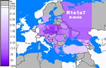 Map showing frequency of R1a haplogroup in Europe
