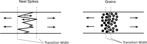 One reason magnetic grains are used as opposed to a continuous magnetic medium is that they reduce the space needed for a magnetic region. In continuous magnetic materials, formations called Néel spikes tend to appear. These are spikes of opposite magnetization, and form for the same reason that bar magnets will tend to align themselves in opposite directions. These cause problems because the spikes cancel each other's magnetic field out, so that at region boundaries, the transition from one magnetization to the other will happen over the length of the Néel spikes. This is called the transition width.