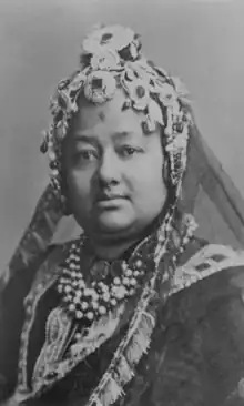 In July 1883, Kunwar's first wife died, subsequently, Devi was promoted to the position of Bada Maharani (lit. Senior Maharani).[4][5] As Bada Maharani, she held substantial power in the Nepal Durbar.[4] In 1882, Jagat Jung Rana, the eldest son of Jung Bahadur Rana, led an attempted coup d'état twice against both the Prime Minister Ranodip Singh and the Army Chief Dhir Shumsher, as a result of this, he was removed from the roles of the succession of Ranas and was exiled to British India.[6] Devi was sympathetic to Jung Bahadur's sons,[7] as a result, she invited Jagat back to Kathmandu, and asked Ranodip Singh to make him the Commander-In-Chief of the Nepalese Army.[4][8][9] Her interference in state affairs resulted in a political crisis and it eventually led to the 1885 Nepal coup d'état.[2][10]