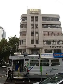 Mitchell House is located at the corner of Elizabeth Street and Lonsdale Street. The building is a fine example of Streamline Moderne, featuring horizontal bands of windows wrapping around the curved corner, broken by a contrasting vertical element topped by the gold lettering of the building's name.