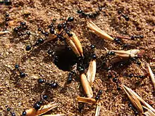 Harvester ant, is a common name for any of the species or genera of ants that collect seeds (called seed predation), or mushrooms as in the case of Euprenolepis procera, which are stored in the nest in communal chambers called granaries.[1] They are also referred to as agricultural ants. Seed harvesting by some desert ants is an adaptation to the lack of typical ant resources such as prey or honeydew from hemipterans. Harvester ants increase seed dispersal and protection, and provide nutrients that increase seedling survival of the desert plants. In addition, ants provide soil aeration through the creation of galleries and chambers, mix deep and upper layers of soil, and incorporate organic refuse into the soil.[2]