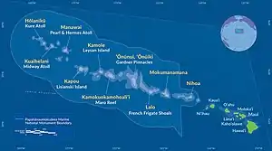 The Papahānaumokuākea Marine National Monument (PMNM) (roughly /pɑːpɑːˈhɑːnmkuˌɑːk.ə/[2]) is a World Heritage listed U.S. National Monument encompassing 583,000 square miles (1,510,000 km2) of ocean waters, including ten islands and atolls of the Northwestern Hawaiian Islands. It was created in June 2006 with 140,000 square miles (360,000 km2) and expanded in August 2016 by moving its border to the limit of the exclusive economic zone,[1] making it one of the world's largest protected areas. It is internationally known for its cultural and natural values as follows: