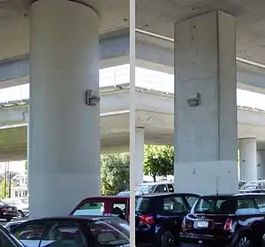 Memorial Stadium supporting columns diverging at the top due to fault creep (the bottoms are in a common footing). External offset shown on left
