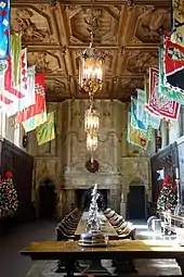 The refectory was the only dining room in the castle, and was built between 1926 and 1927.[173] The choir stalls which line the walls are from the La Seu d'Urgell Cathedral in Catalonia[178] and the silk flags mounted on the walls are Palio banners from Siena.[lower-alpha 20][180] Hearst originally intended a "vaulted Moorish ceiling" for the room but, finding nothing suitable, he and Morgan settled on the Italian Renaissance example, dating from around 1600, which Hearst purchased from a dealer in Rome in 1924.[181] Victoria Kastner considered that the flat roof, with life-size carvings of saints, "strikes a discordant note of horizontality among the vertical lines of the room".[182] The style of the whole is Gothic, in contrast to the Renaissance approach adopted in the preceding assembly room.[160] The refectory is said to have been Morgan's favorite interior within the castle.[183] The design of both the refectory and the assembly room was greatly influenced by the monumental architectural elements, especially the fireplaces and the choir stalls used as wainscoting, and works of art, particularly the tapestries, which Hearst determined would be incorporated into the rooms.[184] The central table provided seating for 22 in its usual arrangement of two tables, which could be extended to three or four, on the occasion of larger gatherings.[185] The tables were sourced from an Italian monastery[186] and were the setting for some of the best pieces from Hearst's collection of silverware. One of the finest is a wine cooler dating from the early 18th century and weighing 14.2 kg by the Anglo-French silversmith David Willaume.[187]