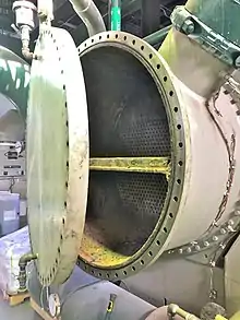 A heat exchanger is a system used to transfer heat between a source and a working fluid. Heat exchangers are used in both cooling and heating processes.[1] The fluids may be separated by a solid wall to prevent mixing or they may be in direct contact.[2] They are widely used in space heating, refrigeration, air conditioning, power stations, chemical plants, petrochemical plants, petroleum refineries, natural-gas processing, and sewage treatment. The classic example of a heat exchanger is found in an internal combustion engine in which a circulating fluid known as engine coolant flows through radiator coils and air flows past the coils, which cools the coolant and heats the incoming air. Another example is the heat sink, which is a passive heat exchanger that transfers the heat generated by an electronic or a mechanical device to a fluid medium, often air or a liquid coolant.[3]