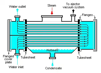 - ↑ Energy savings in steam systems Archived 2007-09-27 at the Wayback Machine Figure 3a, Layout of surface condenser (scroll to page 11 of 34 PDF pages)