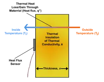 Diagram depicting heat flux through a thermal insulation material with thermal conductivity, k, and thickness, x. Heat flux can be determined using two surface temperature measurements on either side of the material using temperature sensors if k and x of the material are also known.