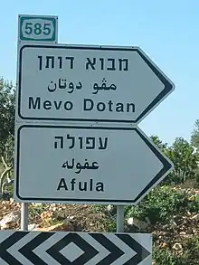 Street signs for Mevo Dotan and Afula. Afula was a Palestinian town sold by the Sursock family to the American Zion Commonwealth in the 1920s; the Hebrew name follows the Arabic, which means "beans".[1]