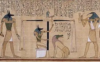 With the rise of the cult of Osiris during the Middle Kingdom the "democratization of religion" offered to even his humblest followers the prospect of eternal life, with moral fitness becoming the dominant factor in determining a person's suitability. At death a person faced judgment by a tribunal of forty-two divine judges. If they had led a life in conformance with the precepts of the goddess Maat, who represented truth and right living, the person was welcomed into the heavenly reed fields. If found guilty the person was thrown to Ammit, the "devourer of the dead" and would be condemned to the lake of fire.[23] The person taken by the devourer is subject first to terrifying punishment and then annihilated. These depictions of punishment may have influenced medieval perceptions of the inferno in hell via early Christian and Coptic texts.[24] Purification for those considered justified appears in the descriptions of "Flame Island", where humans experience the triumph over evil and rebirth. For the damned complete destruction into a state of non-being awaits but there is no suggestion of eternal torture; the weighing of the heart in Egyptian mythology can lead to annihilation.[25][26] The Tale of Khaemwese describes the torment of a rich man, who lacked charity, when he dies and compares it to the blessed state of a poor man who has also died.[27] Divine pardon at judgment always remained a central concern for the ancient Egyptians.[28]