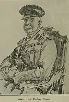Plumer was appointed General Officer Commanding-in-Chief the British Army of the Rhine in December 1918 and Governor of Malta in May 1919.[22] He was promoted to field marshal on 31 July 1919, and was created Baron Plumer of Messines and of Bilton on 18 October 1919.[23] In August 1925 he was appointed High Commissioner of the British Mandate for Palestine.[24] He resisted Arab pressure to reverse commitments made by the British Government in the Balfour Declaration, and dealt firmly with both the Zionists and the Arab Nationalists.[25] On one occasion, an Arab delegation protested a proposal by Jewish battalions to install their regimental colours in the chief synagogues, saying they "wouldn't be responsible for the consequences". Plumer replied, 'That's all right, you're not asked to be responsible for the consequences. I'll be responsible."[26][27] In Mandatory Palestine Plumer gained a reputation as being "genuinely even handed" and was one of the few British administrators who was consistently popular with both the Jewish community and the Arab community in that territory. Privately, he was sympathetic to the cause of establishing a homeland for the Jewish people; however, he tried his best to "be fair" to Arab concerns as well while he was High Commissioner there.[28]