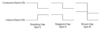 The behaviour of a semiconductor junction depends crucially on the alignment of the energy bands at the interface. Semiconductor interfaces can be organized into three types of heterojunctions: straddling gap (type I), staggered gap (type II) or broken gap (type III) as seen in the figure.[8] Away from the junction, the band bending can be computed based on the usual procedure of solving Poisson's equation.