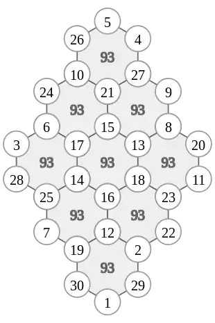 Choi Seok-jeong's original magic hexagonal tortoise pattern. All the sums of six numbers of each hexagon are the same number, 93. The magic sum varies if the numbers 1 through 30 are rearranged. For example, the magic sum could be 77 through 109.