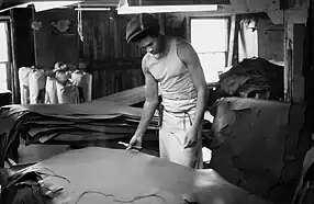 A hide or skin is an animal skin treated for human use. The word "hide" is related to the German word Haut, which means skin. The industry defines hides as "skins" of large animals e.g. cow, buffalo; while skins refer to "skins" of smaller animals: goat, sheep, deer, pig, fish, alligator, snake, etc. Common commercial hides include leather from cattle and other livestock animals, buckskin, alligator skin and snake skin. All are used for shoes, clothes, leather bags, belts, or other fashion accessories. Leather is also used in cars, upholstery, interior decorating, horse tack and harnesses. Skins are sometimes still gathered from hunting and processed at a domestic or artisanal level but most leather making is now industrialized and large-scale. Various tannins are used for this purpose. Hides are also used as processed chews for dogs or other pets.