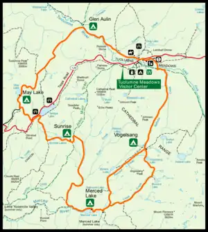 The May Lake High Sierra Camp is a hiking distance of 8.6 miles (13.8 km) southwest, and Tuolumne Meadows Lodge is a hiking distance of 7.6 miles (12.2 km) southeast.[2]