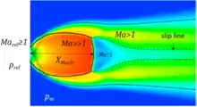 • Highly under-expanded jet: Nearfield with barrel shaped structures. As the pressure ratio increases, the intercepting shock waves can't meet on the axis of the jet anymore, which forces the generation of a normal shock wave when the intercepting shock waves go beyond a certain critical angle (The normal shock wave is called Mach Disk). From the interception point of the mach disk and the intercepting shock, a residual slipstream will reflect outwardly, until it reaches constant pressure from the surrounding fluid, repeating the process, recreating the barrel shaped cell structure (this phenomenon occurs in air at a range of 5 ≤ η0 ≤ 7 or 2 ≤ ηe ≤ 4 ).