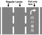 There are four types of exit notification signs. The first notification sign appears two kilometers before the exit, providing the destination name and an Exit 2 km notice. The second sign appears one kilometer before the exit, providing the destination name and a Right Lane notice. The Right Lane notice warns the exiting driver to start switching to the right lane in preparation to exit and does not necessarily indicate that the right lane is an exit-only lane. The third sign appears a few hundred meters before the exit, providing the destination name and a right tilted arrow. The fourth sign is located at the exit and says Exit with a tilted right arrow.