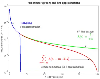 and returns one cycle (N samples) of the periodic result in the imaginary part of a complex-valued output sequence. The convolution is implemented in the frequency domain as the product of the array    with samples of the i sgn(ω) distribution (whose real and imaginary components are all just 0 or ±1). Figure 3 compares a half-cycle of hN[n] with an equivalent length portion of h[n]. Given an FIR approximation for denoted by substituting for the i sgn(ω) samples results in an FIR version of the convolution.