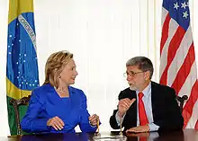 Clinton returned to the diplomatic scene and responded to the ongoing 2009 Honduran constitutional crisis, in which plans for the Honduran fourth ballot box referendum had led to the 2009 Honduran coup d'état, and which was becoming Latin America's worst political crisis in some years.[82] In early July, she sat down with ousted President of Honduras Manuel Zelaya, who agreed on a U.S.-backed proposal to begin talks with the de facto Roberto Micheletti government.[83] Later, in September, Zelaya returned to the country, and President of Costa Rica Óscar Arias, who had become a mediator in the matter, as well as Clinton expressed hope that Zelaya's return could break the impasse with the Micheletti government. In particular, Clinton said, "Now that President Zelaya is back it would be opportune to restore him to his position under appropriate circumstances – get on with the election that is currently scheduled for November, have a peaceful transition of presidential authority and get Honduras back to constitutional and democratic order."[84] At the end of October, Clinton took a leading role in convincing Micheletti to accept a deal – which she termed an "historic agreement" – in which Zelaya would return to power in advance of general elections in which neither figure was running.[82] Micheletti said that Clinton had been insistent on this point: "I kept trying to explain our position to her, but all she kept saying was, 'Restitution, restitution, restitution.'"[82] That agreement broke down, despite efforts of the State Department to revive it,[85] and Clinton and the U.S. ended up supporting the winner of the 2009 Honduran general election, Porfirio Lobo Sosa, with Clinton characterizing the elections as "free and fair" and Lobo as holding a strong commitment to democracy and the rule of constitutional law.[86]