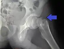 A hip fracture is a break that occurs in the upper part of the femur (thigh bone), at the femoral neck or (rarely) the femoral head.[2] Symptoms may include pain around the hip, particularly with movement, and shortening of the leg.[2] Usually the person cannot walk.[3]