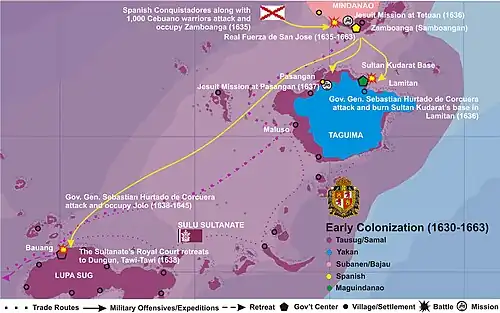 The legendary Sultan Kudarat (Qachil Corralat to the Spanish) of Maguindanao maintained lucrative trade routes between his mainland kingdom and the Sulu Archipelago through a base situated in Lamitan. The Maguindanaos then called the island "Matangal" after the highest visible peak from the Celebes Sea. This base served as a staging ground for much of Sultan Kudarat's offensives against the Spanish until the Spaniards under the command of Governor General Sebastián Hurtado de Corcuera crushed it in 1637, just one year after the Spanish Fort in nearby Zamboanga was established. Spanish reports of the battle listed an Apuh Menggah, and Apuh Dagang and Apuh Batalan as the main Yakan Chieftains leading the local resistance at that time, all of whom were roundly defeated, prompting a significant number of their followers to move farther inland and southwards.