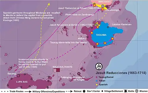 - 1663 - Spanish garrisons in Zamboanga and Basilan were abandoned to defend Manila from an imminent attack from Chinese pirate Koxinga, and the Jesuits took over administration of the missions as "reducciones", Luis Quindingan (former Datu Kindingan) was made Maestro Campo