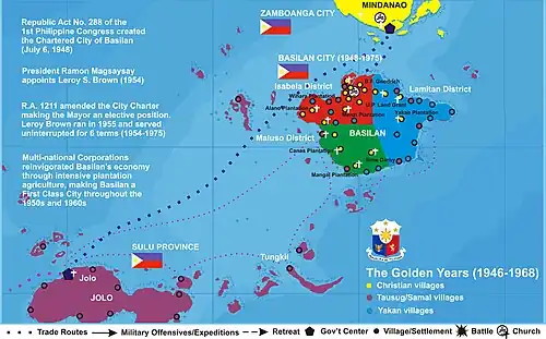 - July 1, 1948 - City of Basilan (R. A. 288,[11] authored by Cong. J. S. Alano) is inaugurated, Nicasio S. Valderroza becomes the first City Mayor (appointed by Pres. Elpidio Quirino)