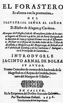 - ↑ El Forastero, Cagliari, Antonio Galcerino, 1636, edited again by María Dolores García Sánchez da CUEC/CFS, Cagliari 2011