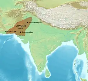The Brahmin dynasty of Sindh (c. 632 – 712),[64] also known as the Chacha dynasty,[65] were the Sindhi Hindu Brahmin ruling family of the Chacha Empire. The Brahmin dynasty were successors of the Buddhist Rai dynasty. The dynasty ruled on the Indian subcontinent which originated in the region of Sindh, present-day Pakistan. Most of the information about its existence comes from the Chach Nama, a historical account of the Chach-Brahmin dynasty.