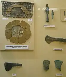 | Entrance to the Akhshtyrskaya Cave | A dolmen near Solokhaul (Sochi) | Plan of a dolmen at Krasnaya Polyana, bronze tips and axes found near Sochi |