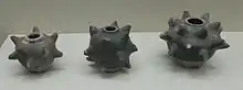 Three hollow pottery caltrops speculated to have been filled with gunpowder. 13th – 14th century, possibly Yuan dynasty (1206–1368).