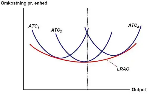 Cost curves as a function of output: the long run average cost (LRAC) given as the envelope of short run average total costs (ARC) minimums.