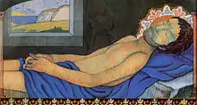In the 15th century the nude had a greater diffusion, framed in the fashionable current of the time, the so called "international Gothic", which emerged between France, Burgundy and the Netherlands around the year 1400. One of its first exponents was The Very Rich Hours of the Duke of Berry by the Limbourg brothers (1416), where a scene from The Fall and the Expulsion from Paradise shows the evolution of Eve from the naturalness of life in Eden to the shame of sin and the expulsion from Paradise, where she takes the form of a Venus pudica that is covered with a fig leaf. Her elongated, bulbous form, with small breasts and bulging belly, became the prototype of the Gothic female nude, which would last for two hundred years. This can be seen in figures such as the Eve of the Ghent Altarpiece by Jan van Eyck, in the Adam and Eve by Hugo van der Goes and in that by Rogier van der Weyden, or in other female figures such as the Vanity by Hans Memling or the Judith by Conrad Meit, where the modest medieval attitude that related the nude as something shameful is giving way to more sensual, more provocative, more carnally human figures.[55] In Spain, the first timid attempts at nudes emerged, far from any sensuality, serious, contained, such as the Descent of Christ into Limbo by Bartolomé Bermejo, the Martyrdom of Saint Catherine by Fernando Gallego, the figure of Saint Tecla in the High Altarpiece of the Tarragona Cathedral, by Pere Johan (1429), or The Slaughter of Saint Cucufate (1504–1507), by Ayne Bru.[56]